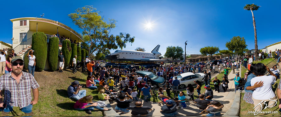 Among thousands blessed with an opportunity to see Endeavour move along the streets of Los Angeles, I captured a few once in a lifetime moments in 360º VR Panoramas. Featured here is a flyover at LAX and now a shot from East of the Forum in Inglewood on Manchester as the Space Shuttle continues its voyage towards Crenshaw, and ultimately the California Science Center, its new and last home.